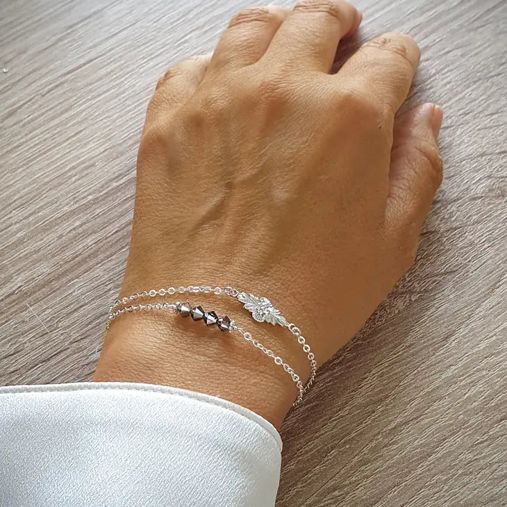 Decorato con diamanti neri, cristalli Swarovski e perle grigie